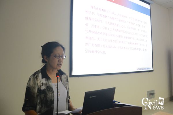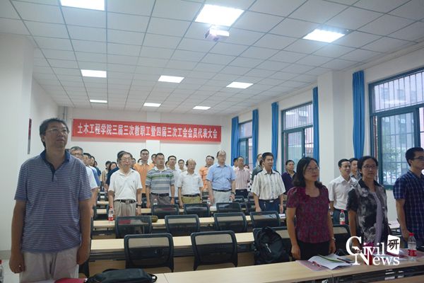 伴随着雄壮有力的《义勇军进行曲》,本次会议正式开始。首先,校工会副主席郑江发表讲话。她充分肯定了土木学院在推进民主管理和为广大教职工服务等方面取得的重大成绩,同时希望土木学院在今后的制度完善等方面继续按照工会法及工会章程加强工作。