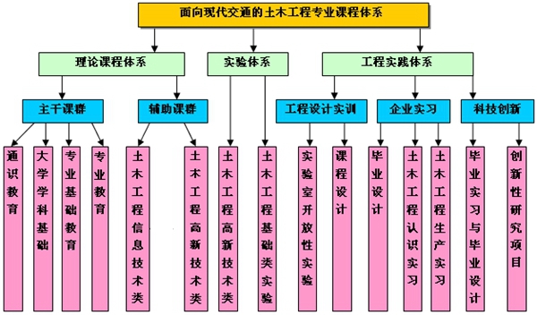 学院针对我国交通事业迅猛发展,特别是高速铁路、轨道交通的建设与发展对交通土建高级专门人才的需求,兼顾“宽基础”和“强专业”的矛盾统一,按照拓宽专业基础、凝练专业主干、强化综合应用的原则,对土木工程专业课群组体系的建设开展全面系统的改革与实践,提出了“夯实基础,强化专业,突出实践,注重创新”的改革理念和“基本理论+工程实践+工程设计+创新应用”的课程组建设思路,构建“创新为魂、实践为线、基于行业、面向世界”的特色土木工程专业课程群体系,构建并实施了技术基础核心课程通用化,专业核心课程群精品化、实践技能课程系统化、创新教育层次化的核心课程群体系。