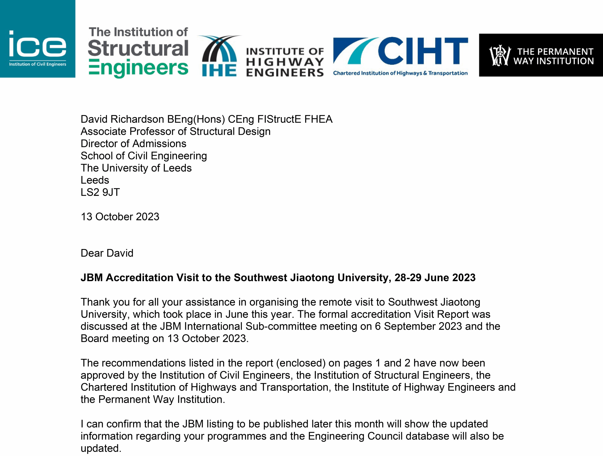 JBM是英国土木工程领域四大专业认证机构之一,由英国土木工程师协会(ICE)、结构工程师协会(IStructE)、特许高速公路及运输协会(CIHT)、高速公路工程师协会(IHE)和英国铁路协会(PWI)组成的联合委员会五个专业组织构成。根据英国专业工程能力标准(UK-SPEC)的规定,获得该认证学位的学生部分满足英国注册特许工程师(CEng)的要求,完全满足注册技术工程师(IEng)的要求。
