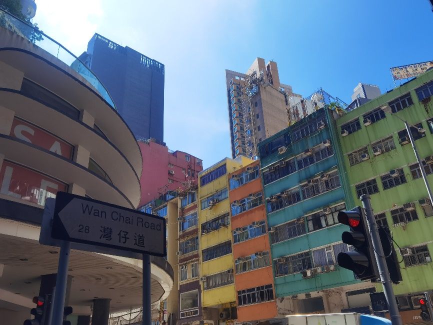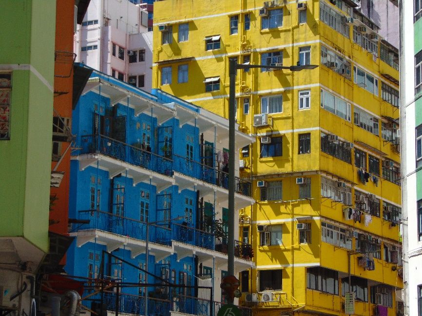 这里还充斥着许多特别的色彩,淡紫色的公交车驶过时一下神摇目夺。走进繁华热闹的香港湾仔街市,一大排彩色的屋子出现在眼前,在高楼林立、寸土寸金的城市里寻觅那幢全身上下“穿”着蓝外套的蓝屋。