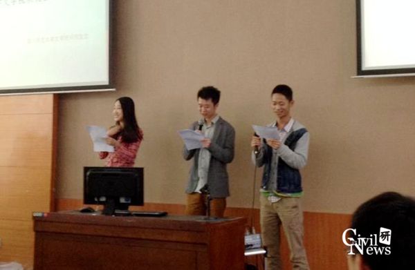 首先,四川师范大学文学院研究生会主席尹鸾同学介绍了该学院的专业分布,院研会的部门设置和常规活动。其中的两种特色活动具有浓厚的文学气息,即面向在校学生的“天一阁学术论坛”和面向社会大众的“天府人文讲座”,通过这两种讲座不仅可以提高同学们的学术能力,而且增强了社会责任感。
