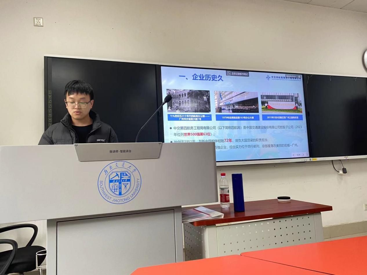 见面会伊始,刘书停导师向同学们致以亲切问候,他同时深入介绍了中交四航局所承包的中外业务、公司发展优势以及代表项目,向同学们生动地展示了中交四航局在建筑工程领域的实力,特别展示了公司在技术、项目管理和团队协作方面的优势。这次介绍旨在帮助同学们更全面地了解建筑行业,并为未来的职业决策提供实际参考。刘书停导师的分享,为同学们描绘了一张真实的职业发展图景,为同学们在职业生涯的探索中提供帮助和指导。