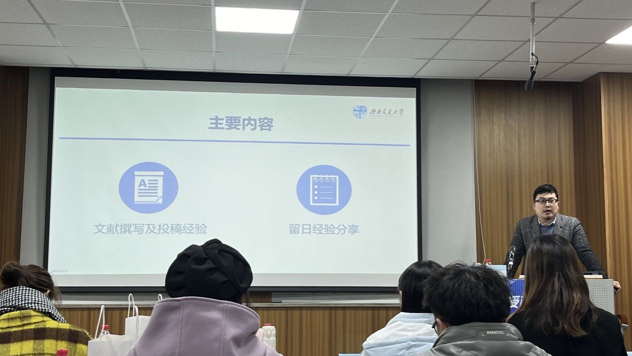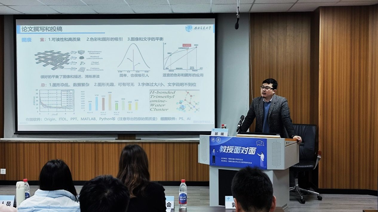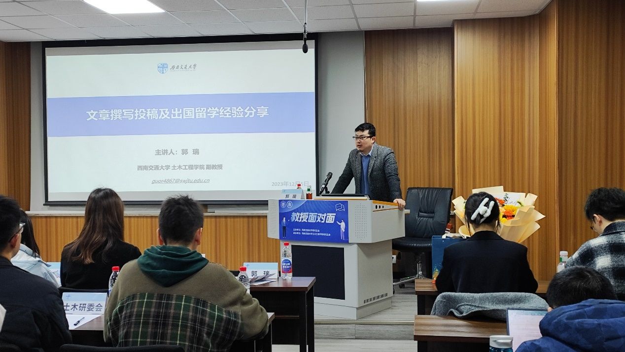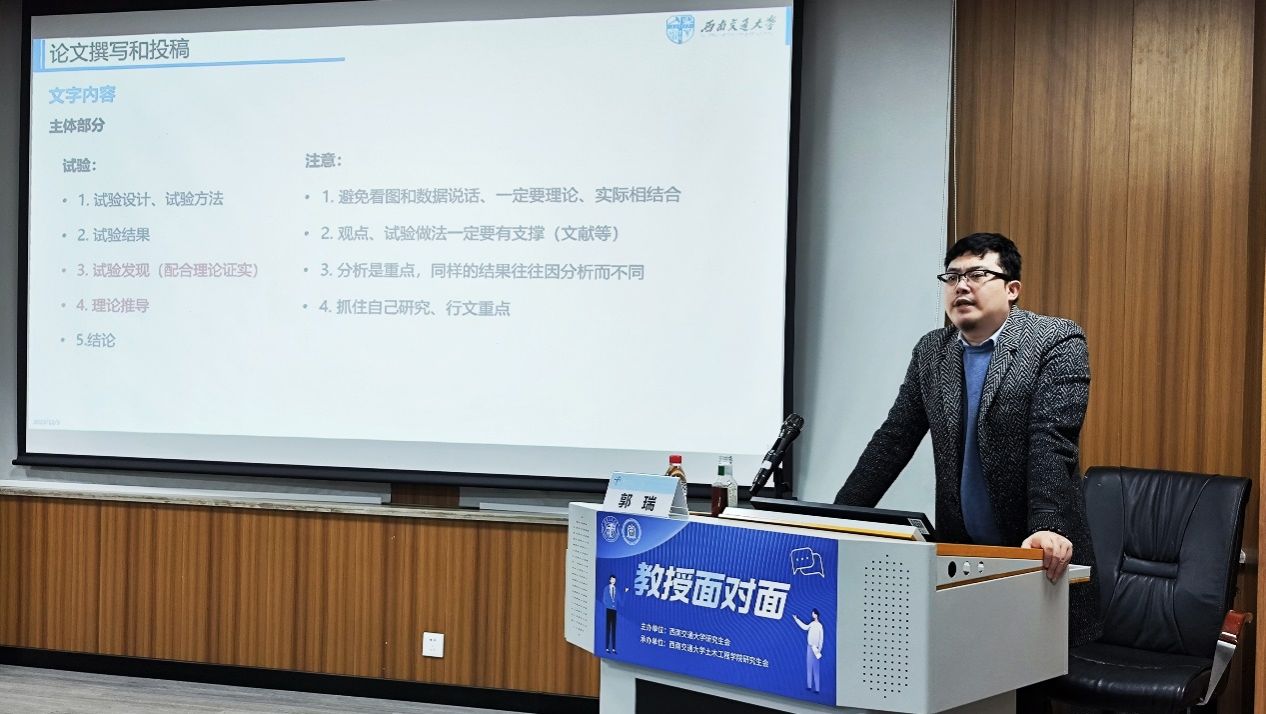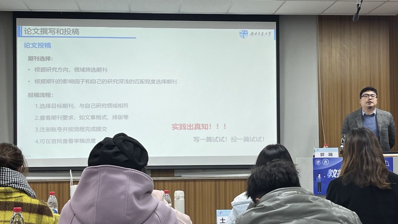 本次讲座邀请了郭瑞老师,围绕科研论文的撰写技巧、文章投稿的流程介绍和出国留学的经验分享等方面进行深入交流,向广大研究生同学传授科研基础知识,引导本校研究生基于学术志趣合理规划生涯目标,夯实科研能力,储备丰厚的专业技巧,树立坚韧不拔的科研毅力和浓厚的研究热情。