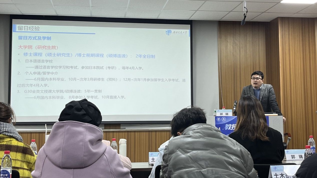 首先,郭瑞老师详细地介绍了日本行政区域的划分与日本大学分类,帮助同学们了解日本留学的基本情况。然后郭老师一一介绍了日本的帝国“七大”与东京工业大学等知名国立大学。除此之外,郭老师还介绍了大阪市立大学等公立大学及早稻田大学等私立大学。紧接着谈及留日方式及学制时,郭老师详细介绍了修士课程、博士前期课程与后期课程,并表示应多搜集信息了解国外留学的升学时间,切勿理所当然地以为国外升学时间与国内同步。