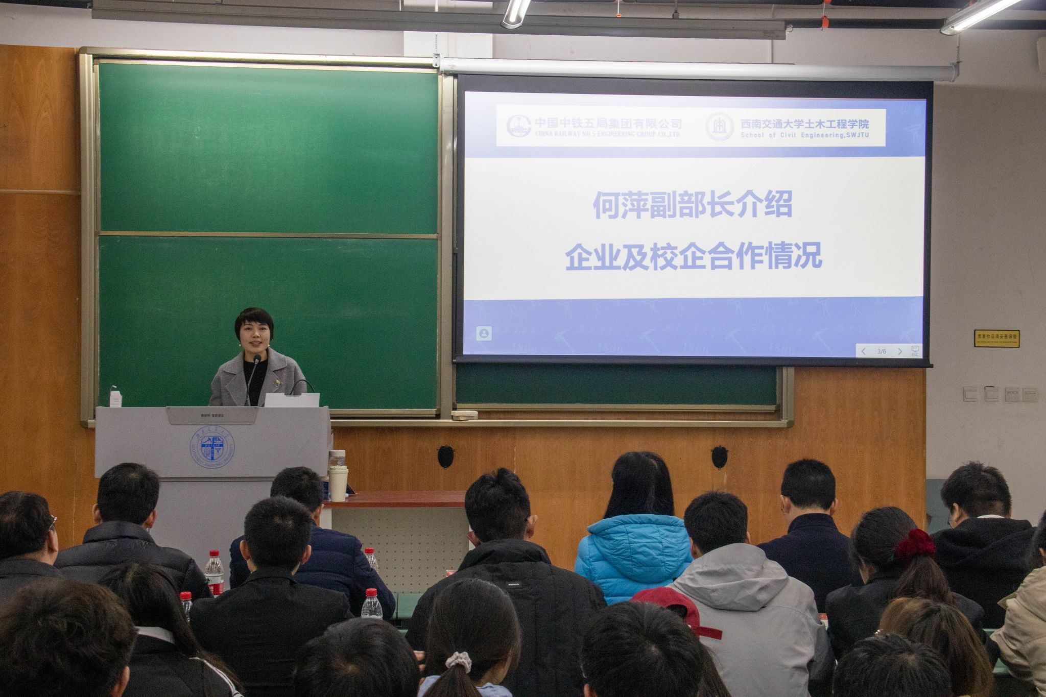 会议第一项,由何萍副部长进行讲话。何萍副部长依据企业基本情况和校企合作情况进行了简要介绍,让同学们对中铁五局有了更深入的了解,并围绕“企业生涯规划”为同学们进行具体讲解,同学们均受益匪浅。