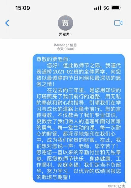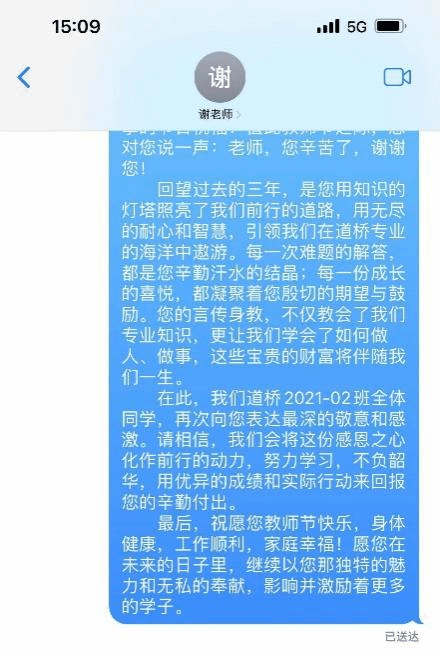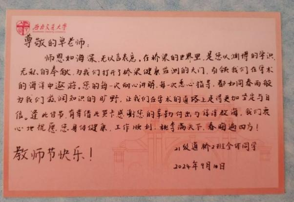 除了开展支部学习、观看电影等活动,在教师节当天,党员同志们纷纷向班导师和任课教师们献上了鲜花,并以贺卡、书信、短信等形式,向各位老师表达真挚的敬爱与感恩之情。向恒葵同志代表道桥2021-02班全体同学向班导师送上教师节祝福。谢老师、贾老师向同学们回以美好的祝福,殷切期盼同学们学业进步、心想事成。