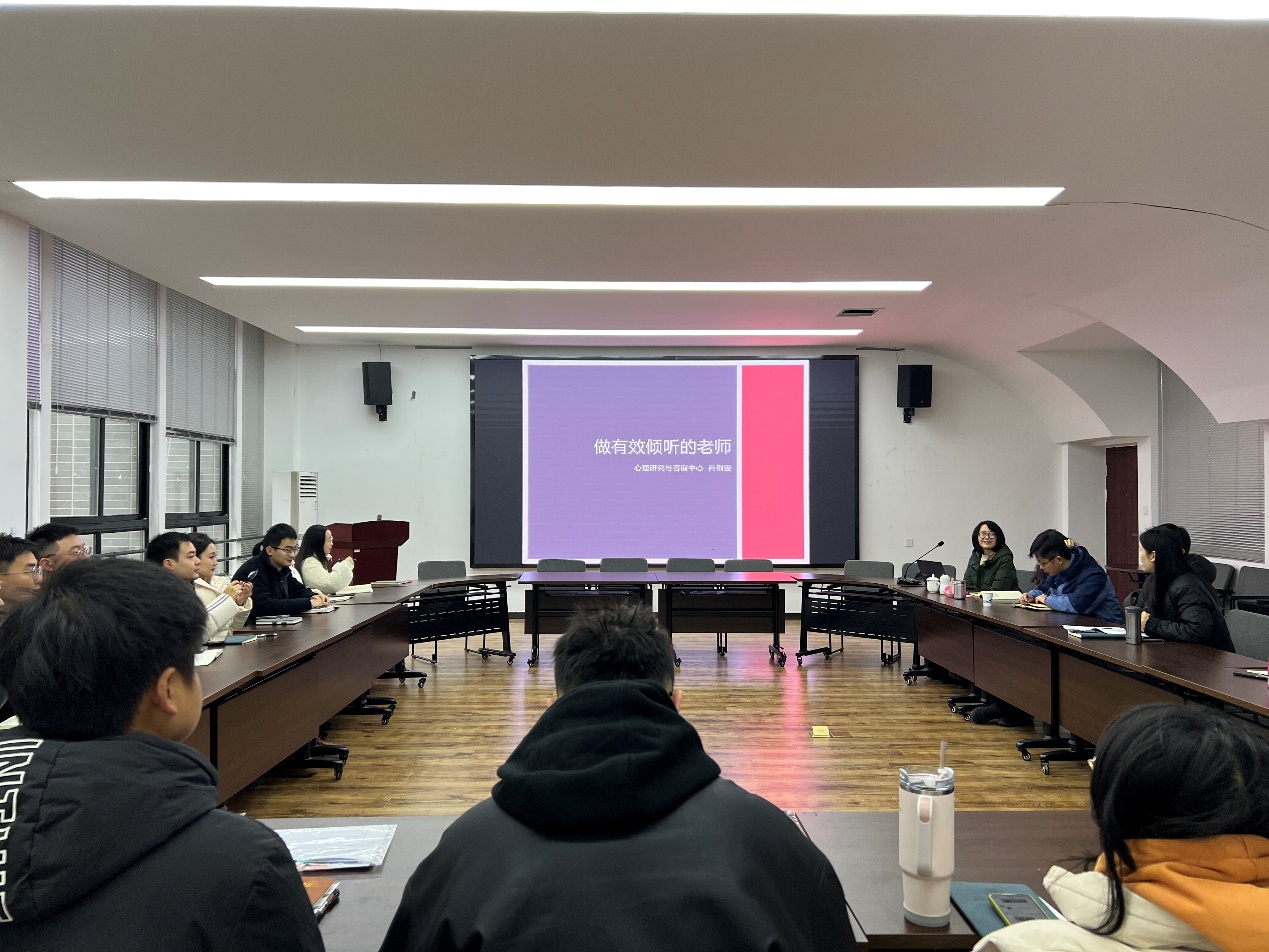 12月18日上午,学院学工组在X4407开展本学期心理技能培训。活动邀请到心理研究与咨询中心冉俐雯老师主讲“做有效倾听的老师”专题,学院学工组集体参与学习。活动由学院党委副书记刘萍主持。