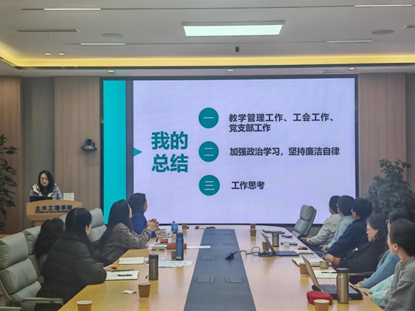 黄雪娇老师汇报了综合事务办公室2024年度工作情况;甘泉老师从负责的党务工作、教师服务工作、纪检工作和工会教代会工作进行了汇报;王艺霖老师对本年度教学管理工作、工会工作和机关党支部工作情况进行了详细介绍;熊麟老师聚焦“两个系统、三大平台、六大板块”介绍了2024年度党建工作;王楠老师从负责的专任教师岗位聘任、学科相关工作、培训中心工作、党委工作、工会工作进行了汇报。