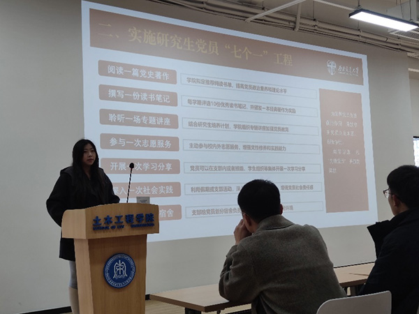 其次,会议介绍了 “七个一” 工程的具体内容和实施目标。“七个一” 工程包括阅读一次党史著作、撰写一份读书笔记、聆听一场专题讲座等七个关键任务,旨在通过多样化的活动形式,增强研究生党员的党性修养和责任意识。各党支部书记围绕 “七个一” 工程进行了交流分享,部分党支部书记介绍了在组织主题党日活动中的创新做法和经验,如结合专业特色开展实践活动,将党建工作与学术研究相结合等,为其他党支部提供了有益的借鉴。