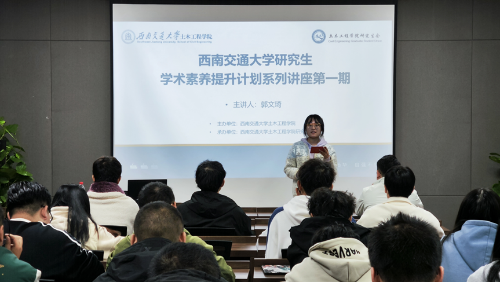 为助力学生快速进入研究生学习生活状态,加强学生对于学校、学院、学科的归属感,认同感。2023年10月12日学院为研究生新生开展理想信念教育,石莹老师给学生们介绍了学校和学院的优良传统、历史文化及土木工程学科的成就,增强学生对学院和专业的认知度和认可度。并在讲座中提到中国式现代化是实现中华民族伟大复兴的根本之路,强调当代青年应秉承交大精神,勇担科技报国、交通强国的使命。