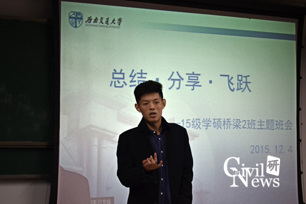 12月4号晚上7点半,2015级学硕桥梁二班在逸夫馆4322召开班风建设主题班会。主题班会由班长王康康主持,学硕桥梁二班全体同学参加了班会。班会共分为三项,首先是班委成员总结近半学期的工作及下学期规划,然后是班级成员分享自己的学习经历,最后班长王康康就关于近期出现的安全问题提醒大家注意防范。