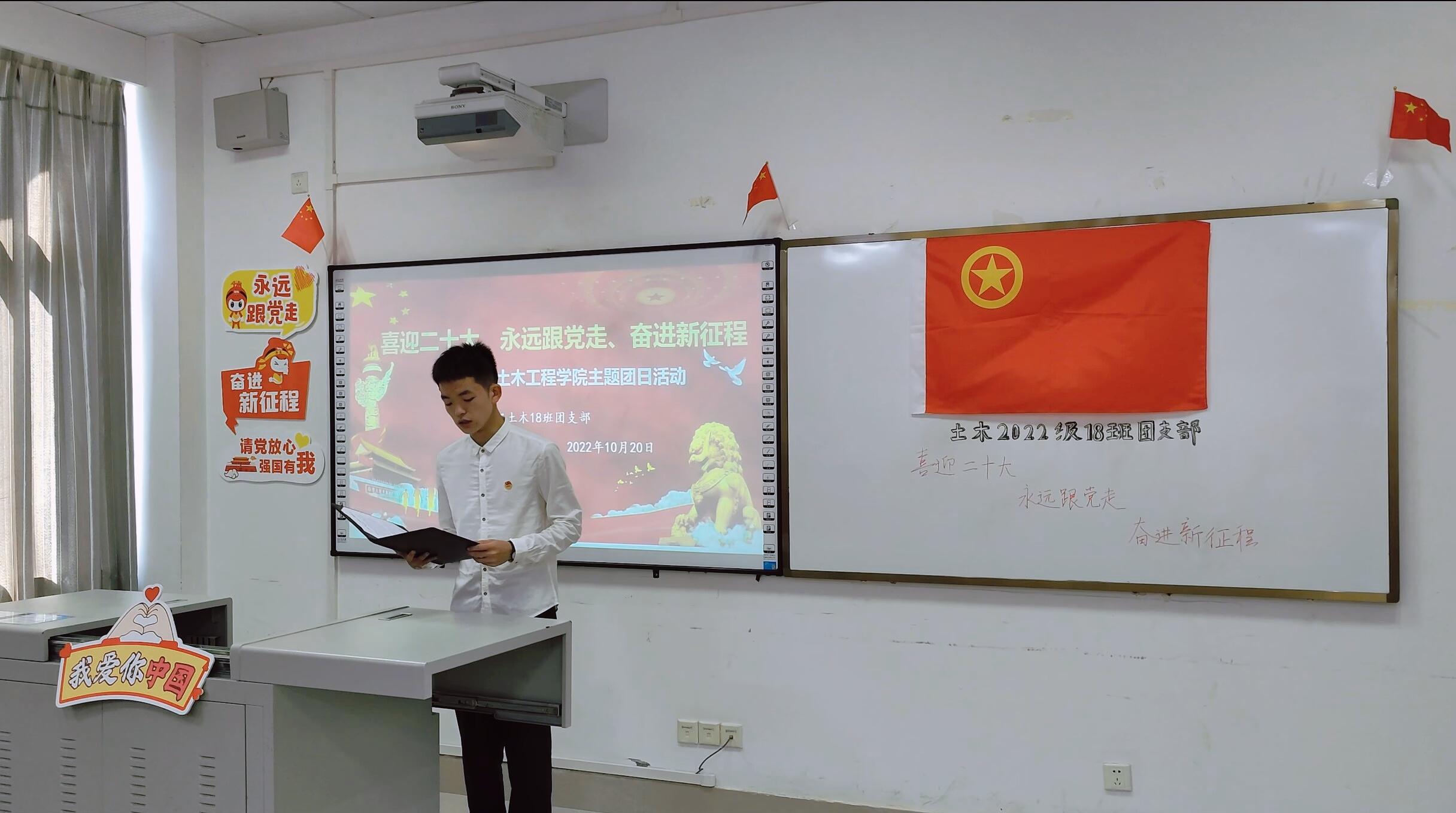 2022级18班团支部全体成员于10月20日在X4134教室开展了“喜迎二十大 永远跟党走 奋进新征程”主题团日活动。团支部全体成员共24人积极参与活动,开展时长90分钟。