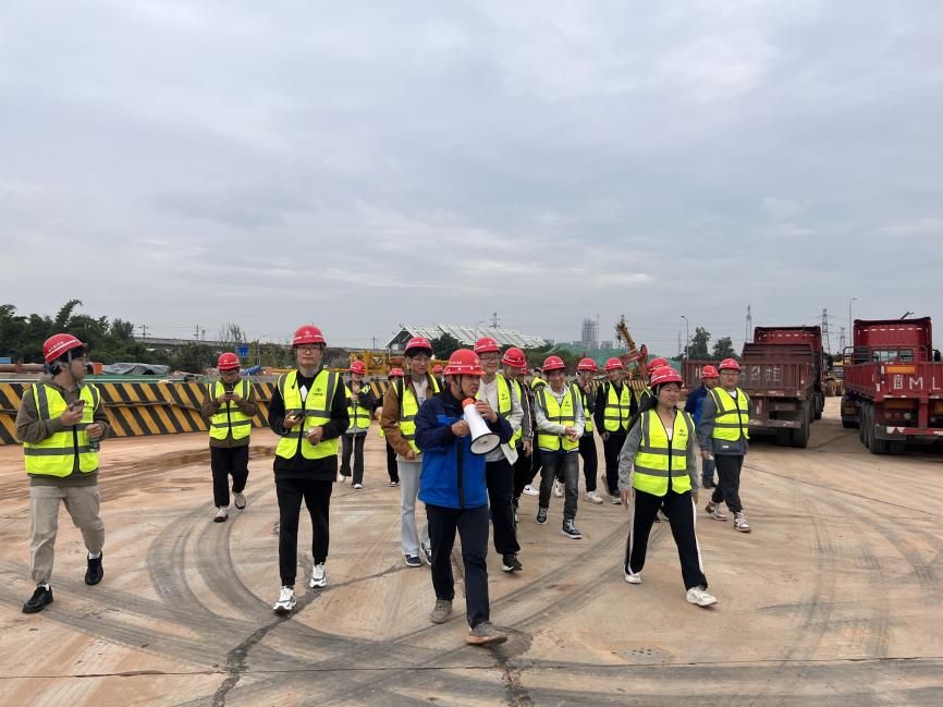 下午两点,同学们准时集合坐上大巴车前往中交二航局成都地铁30号线项目龙泉站施工现场。到达现场后,同学们戴上安全帽,穿上反光服,跟随项目部工作人员进行现场参观,听他为我们讲解线路的设计理念和施工规划等。