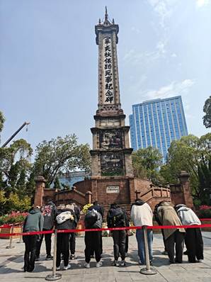 在辛亥秋保路死事纪念碑前,同学们聆听了讲解员对1911年四川保路运动的详细讲解。这座建于1913年的纪念碑,是为纪念四川保路运动中牺牲的烈士而建,碑身四面镌刻着“辛亥秋保路死事纪念碑”字样,由四位四川书法家分别用楷、草、行、隶四种字体书写,展现了中国人民反帝反封建的爱国意志和牺牲精神。