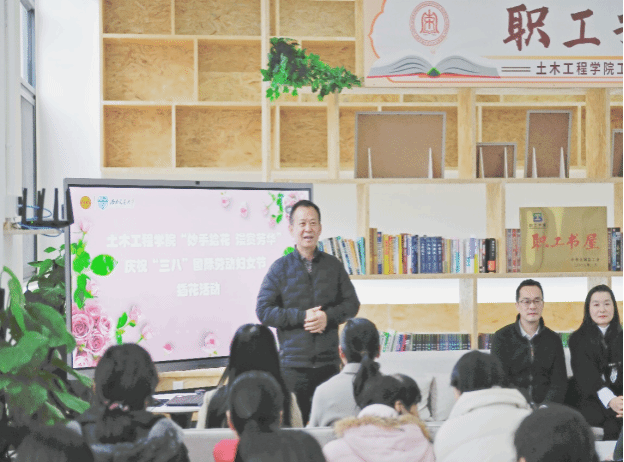 3月8日上午9:30,土木工程学院庆祝第114个“三八”国际劳动妇女节插花活动在九里校区学院职工之家举行。土木工程学院院长蒲黔辉、副院长富海鹰、副院长勾红叶、副书记周曦、副书记车小洁,校工会组织(女工)部部长陈秀梅老师,学院女教职工、工会干部和机关党支部党员参加了活动,活动由学院工会主席王艺霖主持。