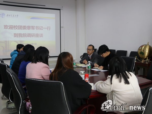 分团委调研交流座谈会于犀浦校区X4312会议室如期举行。与会人员有:校团委书记廖军、校团委兼职副书记陈景适,萝莉岛