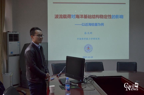 接着,漆文刚研究员就实验设备介绍、近海桩基局部冲刷及其影响、桩基防冲刷措施简述、未来研究的几点想法四个部分与大家开始了详细认真的学术讲解。漆研究员根据现场的同学大多来自桥梁工程专业,灵活的调整讲解重点,把最能吸引同学,最让同学们感兴趣的桩基础方面的知识做了详细讲解。