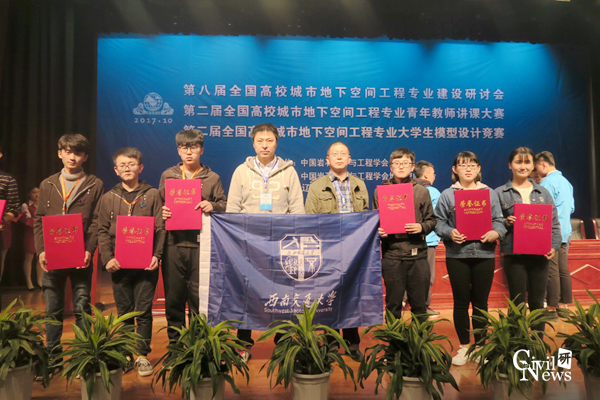 师生代表参加了本次大会中的青年教师讲课大赛和模型设计竞赛,均获得了荣誉满载而归。于丽副教授和冯冀蒙讲师参加了青年教师讲课大赛,与来自全国多所高校的50余名教师同台竞技,经过精心准备和激烈角逐,于丽副教授讲授的《地下铁道》课程喜获本次讲课比赛特等奖,冯冀蒙讲师讲授的《隧道工程》课程荣获本次讲课比赛三等奖。郭春副教授指导6名本科生分为两个参赛队参加了模型设计竞赛,同学们克服重重困难,从72支参赛队中脱颖而出,其中全力引队获得二等奖、戴明昊队获得优胜奖。