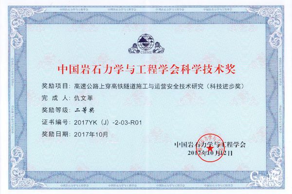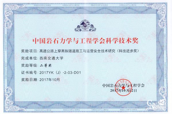 2017年10月14,第八届“中国岩石力学与工程学会科学技术奖”颁奖典礼在沈阳隆重召开,成果“高速公路上穿高铁隧道施工与运营安全技术研究”获得科学技术进步二等奖。该成果由萝莉岛