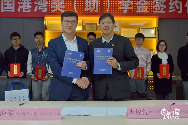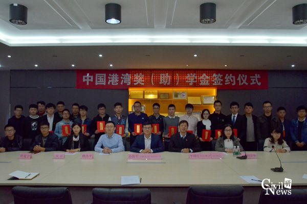 九里校区逸夫馆4207会议室举行。中国港湾人力资源部副总经理兼党委工作部副部长孙海军、中国港湾人力资源部人力主管魏伟平、土木学院党委副书记李锦红、土木学院学工组副组长刘萍、土木学院2014级本科生辅导员向京华、土木学院2017级研究生辅导员叶礼宁及土木学院13名获奖学生参加了签约仪式。仪式由土木学院学工组副组长刘萍主持。