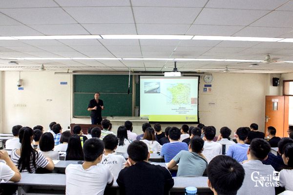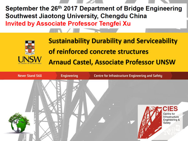 2017年9月26日上午10点,Arnaud在九里校区逸夫馆4318教室带来了一场题为“Sustainability Durability and Serviceability of reinforced concrete structures”的学术报告。桥梁系占玉林副主任,建工系杨成副主任,李福海副教授,孙晓丹副教授,邓开来博士,梁艳博士等老师以及七十多位博士、硕士研究生参加了报告会,报告由徐腾飞副教授主持。