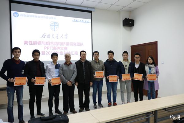 经过精彩、激烈的角逐,卜一之教授公布了比赛名次,崔闯获得一等奖,康纪平等3人获得二等奖、黄懋科等4人获得三等奖,张清华和卜一之教授为获奖选手颁发获奖证书并合影留念。比赛结束后博士生杨绍林(导师为秦顺全院士)针对海啸溃坝的研究进展进行了学术汇报,介绍了自己在学术研究和能力培养方面的心得体会,毕业研究生代表傅贤超结合自身研究生生涯的经历和工作体会与团队研究生进行了交流和互动。下午5点,主持人宣布“张清华、卜一之教授科研团队举办第二届PPT演讲比赛暨团队培养章程第三版发布会”圆满结束。