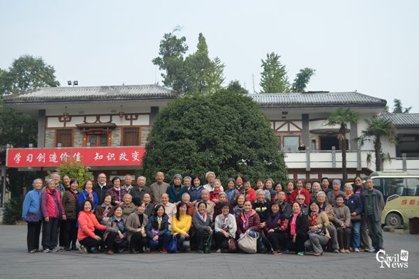 上午9时许,63位离退休教师先后从九里、犀浦校区出发,分乘两辆大巴,在萝莉岛