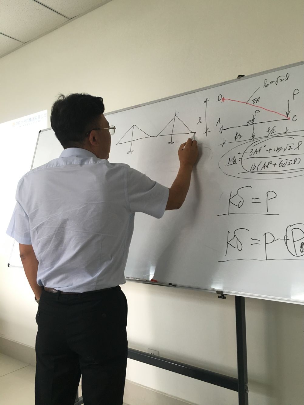 秦院士指出,现代桥梁技术的两个主要标志是基于有限元方法的现代桥梁计算理论和桥梁分阶段成形施工技术。而无应力状态法理论就是基于结构分阶段成形施工技术发展而来,并上升到相对完备的理论体系,进而更有效地指导分阶段施工的理论。作为该理论的开拓者和奠基人,秦院士对其精髓及工程应用价值有着精准的把握。针对但启联所作工作中存在的疑惑和与会人员的提问,秦院士采用板书和幻灯片的形式,从最基本的结构分阶段成形过程出发、详细阐述了无应力状态法的理论推导过程,并结合工程案例阐述了无应力状态理论在工程实践中巨大的理论指导作用。秦院士的讲解及答疑精彩独到,参会人员踊跃提问,会场气氛热烈,每位参会人员都受益匪浅。