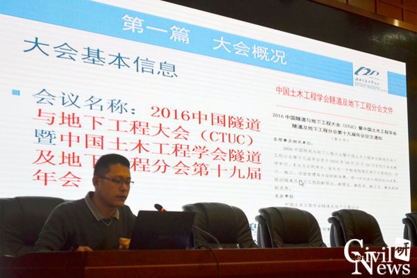 10月15日周六上午10点,在九里校区网络学院一楼国际会议厅举行了“2016隧道大会志愿者动员大会”,地下工程系仇文革教授、晏启祥教授、蒋雅君副教授、方勇副教授、汪波副教授、龚伦副教授、郑余朝副教授参加了大会。动员大会的内容分为两部分:1.仇文革教授介绍隧道大会的基本情况;2.蒋雅君副教授对志愿者分组、大会基本注意事项、大会工作礼仪等内容进行介绍。