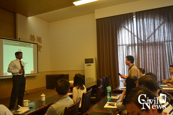 的基本情况,包括本科生和研究生的课程设计、培养目标等。然后,对钢筋混凝土结构无损检测技术做了报告,重点介绍了3种传感器(电阻式传感器(electrical resistance sensor)、腐蚀传感器(corrosion sensor)和光纤传感器(fiber sensor))在混凝土结构无损检测中的研究和应用情况。基于这三种无损检测技术,混凝土结构的性能可以被实时监测,并可建立服役寿命预测模型,用于预测其服役时间,便于工程师采用加固或者维护措施。同时,Basheer 教授还介绍了土木工程中的NDT检测方法,该方法帮助我们理解外界的腐蚀性物质以多快的速度侵蚀混凝土结构,从而影响结构的耐久性和服役寿命。最后,他通过对比不同服役寿命的预测模型,指出了将来研究工作的重点和方向。