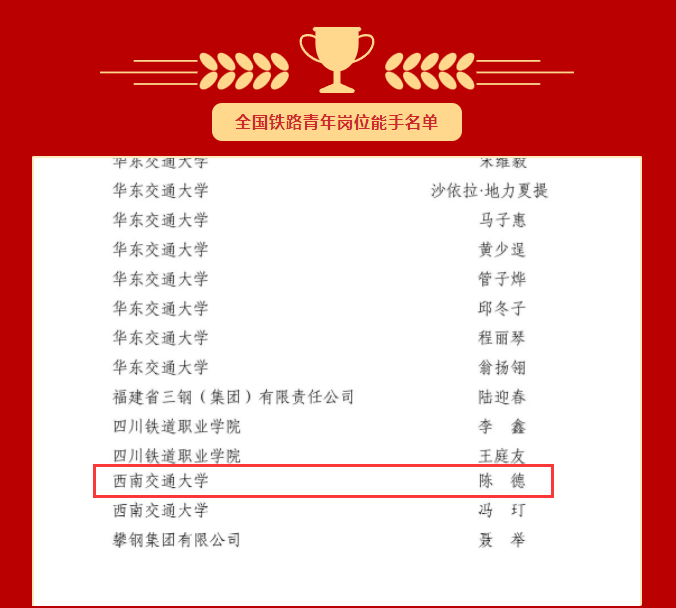 陈德荣获“全国铁路青年岗位能手”。