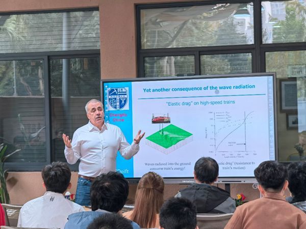 上午报告主题是“高速铁路系统中的振动和波动”。Metrikine教授从物理层面对高速移动荷载引起的多种波动效应进行了详细地解释,分析了非线性、非均匀支承、土体各向异性等对高速铁路系统振动和波动的影响。最后,Metrikine教授介绍了反常多普勒波可能引起的高速列车动力失稳现象。