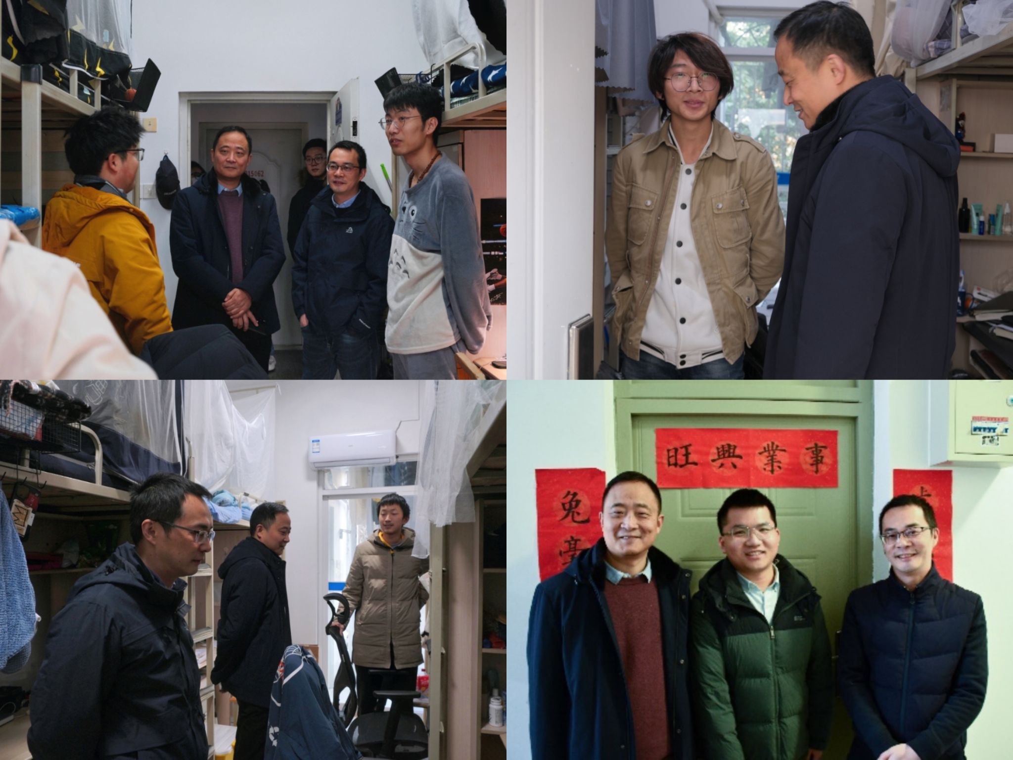 期末进行时,高平平书记、周曦副书记及学院学工组的辅导员老师们来到犀浦、九里两校区学生宿舍,了解学院学生在期末考试期间的生活及学习状态。高平平书记细心了解了同学们的生活、学业和就业问题,提醒同学们严格落实学生公寓管理规定,悉心嘱咐同学们在冬季要注重宿舍安全,不使用违章电器和明火,指出辅导员们要持续深入学生宿舍,及时为有困难、有需要的学生提供帮助,并为同学们送上了新年祝福。