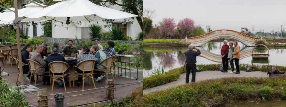 这里有山有水,林木荫郁,廊苑亭榭,宛若世外桃源。老师们或农庄中漫步,感受亲近自然,或在树下湖边拍照打卡,共享春意,或于茶桌前与老友品茗,共叙往昔时光……