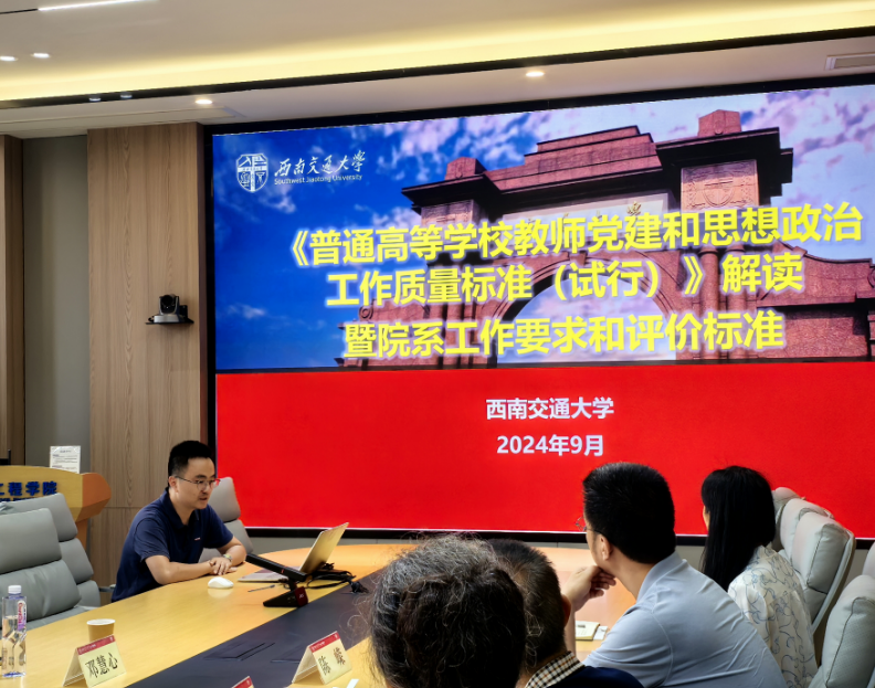 在犀浦校区4417A会议室召开党委和党政联席会议,学院领导班子成员、全体党委委员、科职干部以及部分教师代表参加了本次会议。会议邀请了学校机关与直属单位党委常务副书记沈哲、机关与直属单位党委综合管理办公室副主任奉天、党委教师工作部思政科科长崔健、重大工程办公室(川藏铁路研究院)项目主管邓慧心到会进行了“政策直通车”宣讲。本次宣讲的主要内容是师德师风建设专题和CZ铁路信息安全工作政策专题。