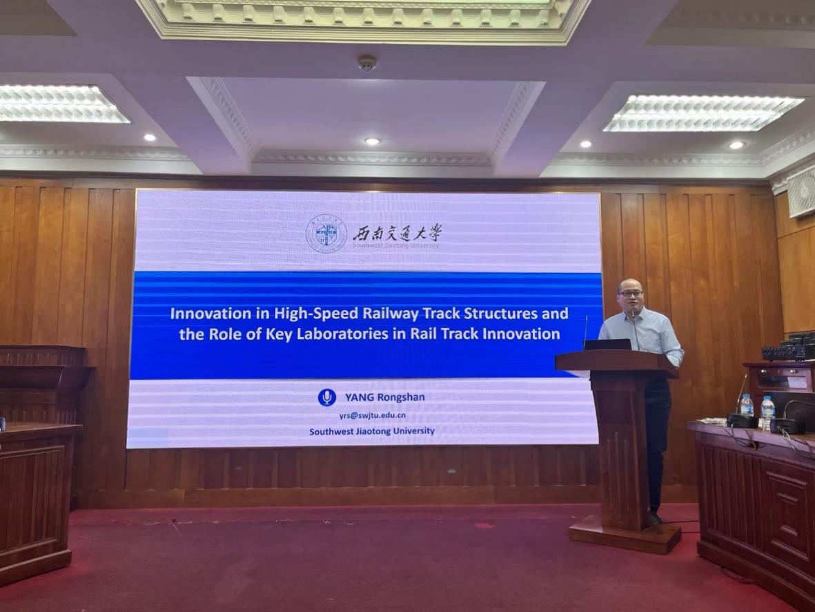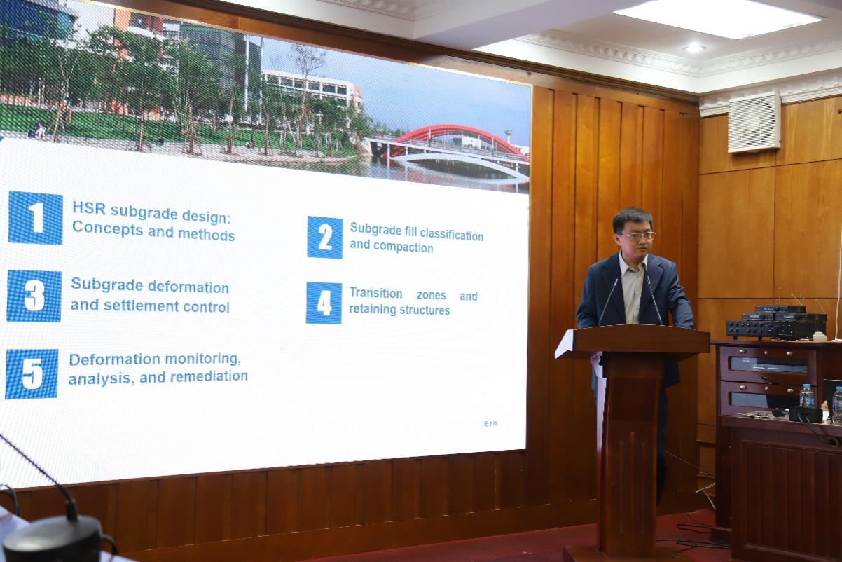 刘先峰副主任(线上参与)、杨荣山教授和王腾飞副教授分别发表学术报告,与参会专家学者深入交流。刘先峰教授报告题为《Insights into the Construction of Standard System for Railway Interconnectivity》,介绍了高铁建设标准体系的搭建,并分享了中国标准在国际铁路互联互通中的重要作用。杨荣山教授通过《Innovation in High-Speed Railway Track Structures and the Role of Key Industry Laboratories in China》报告,深入阐述了无砟轨道与有砟轨道的技术特点,回顾了中国无砟轨道技术的演变与行业重点实验室在推动技术进步中的作用。王腾飞总结了题为《Recent Advances and Practices in High-Speed Railway Earth Structures in China》的学术内容,详细介绍了高铁路基结构设计理念、沉降与变形控制技术、过渡段设计及支挡结构选型等前沿内容,并分享了中国在高铁路基病害整治中的经验。