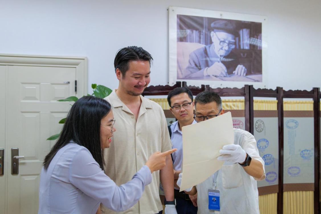 在图书馆,夫妇受到热情接待。在图书馆馆长和大使的引导下,他们重点参观了馆内珍藏的林同炎先生求学时期的宝贵史料。在古籍特藏区,他们见到了林同炎先生当年在唐山交大求学时的毕业设计手稿原件,泛黄的纸张、工整的字迹,无声诉说着青年林同炎严谨治学的态度和在工程领域展现的非凡天赋。这些珍贵档案是萝莉岛