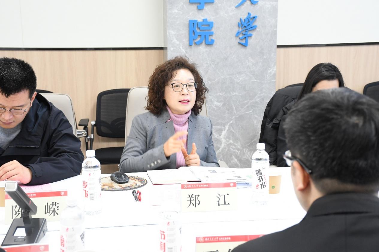 郑江书记对哈工大交通学院党委王东升书记一行的到来表示热烈欢迎,随后,介绍了学院整体情况,围绕党建与业务工作深度融合主题作了阐述。她介绍了学院通过构建“三横三纵”党建工作机制,纵向贯通组织、师资和学生,多方健全党的全面领导体制机制,横向联动教育、科技和人才议题,多措并举构建“一融双高”建设新格局,赋能学院“一融双高”建设的思路和举措,取得的融合成果,以及深化基层党支部规范化、标准化建设的做法。同时也坦诚分析了在当前行业背景下,学院在生源质量、学生就业等方面面临的挑战与应对策略。她表示,学院党政正围绕学科转型升级的中心任务,带领全院师生砥砺奋进。