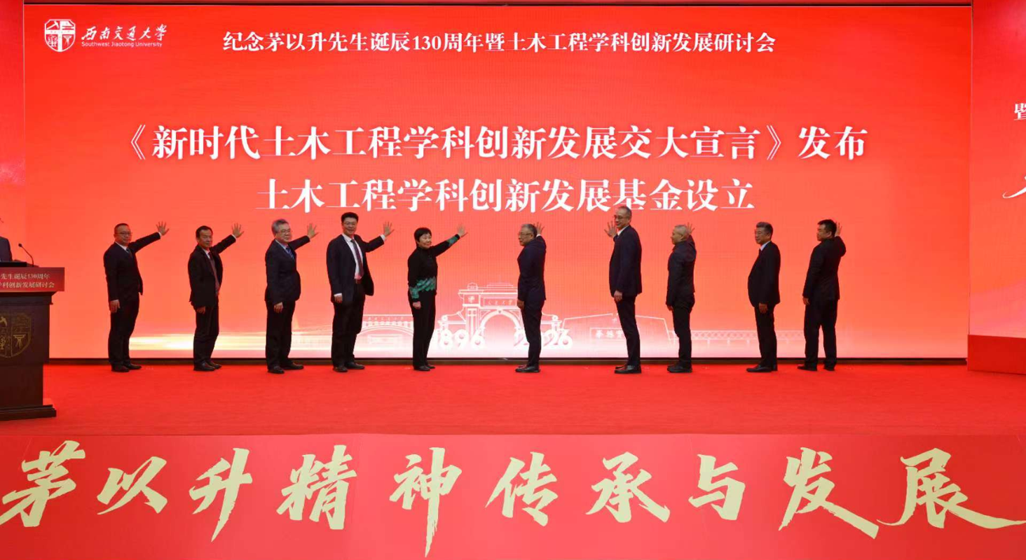 秦顺全、茅玉麟、余敏明、闫学东、任辉启、何川、张敏、李传富、邓军桥、蒲黔辉共同启动《新时代土木工程学科创新发展交大宣言》发布暨土木工程学科创新发展基金设立仪式。