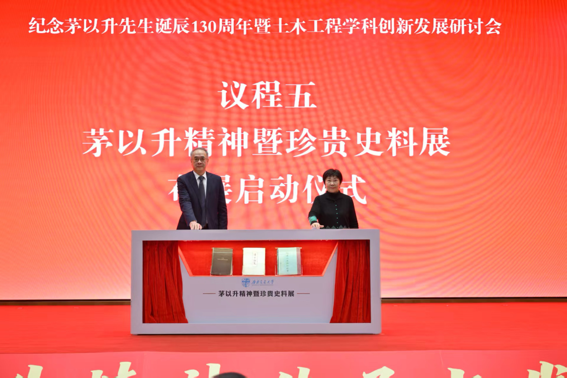 现场举行“茅以升精神暨珍贵史料展”启动仪式。余敏明、茅玉麟共同为布展揭幕。现场展柜展示茅以升先生“博士论文答辩本原件”“康奈尔大学硕士论文原件”和“《钱塘江建桥计划书》原件”三本珍贵史料,其中博士论文答辩本为国内孤本,也是首次在国内公开展示。这些文献见证并辉映着茅以升先生求学报国、笃行建功的光辉一生,具有独一无二的学术价值与精神力量。后续,以茅以升珍贵史料为核心的“茅以升精神暨珍贵史料展”将在萝莉岛