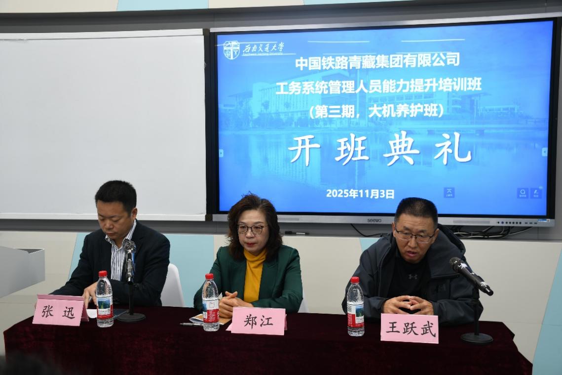 党委书记郑江在致辞中指出,青藏铁路是“国家的荣耀、民族的骄傲”,保障其安全高效运营责任重大。郑书记简要介绍了学校历史沿革以及土木学院的师资力量与荣誉成就。对于本次培训的课程设计,学院以青藏公司大机养护的核心需求为导向,坚持“理论筑基、技术强化、实操为本、管理提效”原则,整合校内多学院师资及企业专家资源,构建系统化培训体系。她对学员提出三点期望:心怀“国之大者”,将学习成果转化为守护“天路”的实际担当;聚焦运维实际,弘扬青藏铁路精神,破解现场难题;践行工匠精神,助力高原铁路实现智能化、绿色化、韧性化发展,服务交通强国建设。