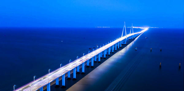 1.杭州湾跨海大桥首先采用了浙江、上海、江苏的吴越文化观念,在设计中首次引入了景观设计的概念。整座大桥平面为S形曲线,总体上看线形优美、生动活泼。